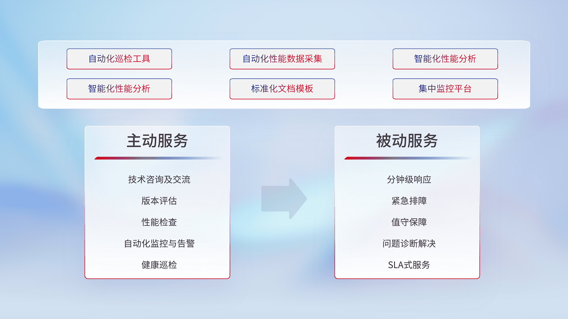 智能化工具和标准化文档,,,,保障服务质量,,,提供主动服务(包含技术咨询、、版本评估、、、性能检查、、、、自动化监控与告警、、、、健康巡检)和被动服务包含(分钟级响应、、、紧急排障、、、、值守保障、、、问题诊断解决、、、、SLA服务)。。。。