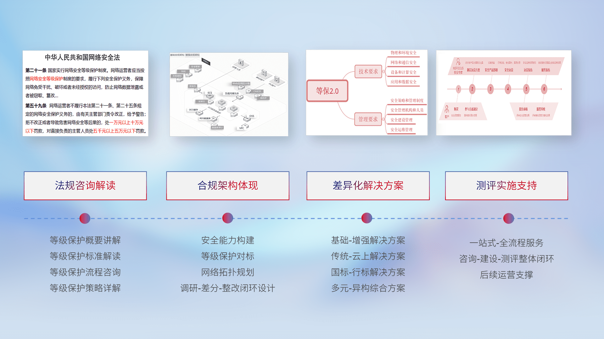 通过专业的法律咨询解读、、、合规架构体现、、、、差异化解决方案、、测试实施支持等服务,,,为客户量身打造等保合规体系。。。。